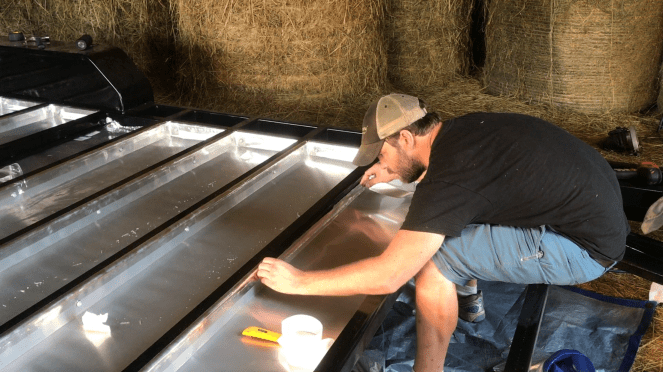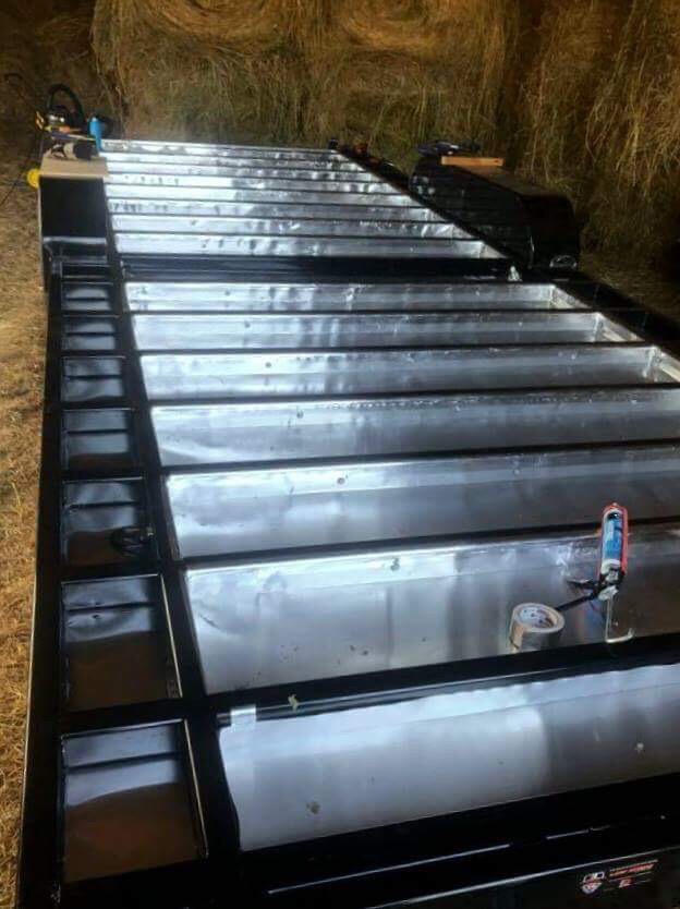 The reason this is a big deal is because we have finished a step! We have spent so many days prepping and planning and buying a ton of stuff, and driving all over Missouri and Arkansas to get said stuff, that it was starting to feel like we were never gonna start building this thing! On top of that, this step was a difficult one, not only mentally, but physically (poor Anderson!). Without going into too much technical detail (if you want that, watch the videos we will be posting on our YouTube page), Anderson figured out a way to install the flashing so that he didn’t have to crawl under the trailer and drill straight up, into thick metal, for days on end. This meant, however, spending much more time in the shop cutting and bending the flashing into a bunch of trays that would sit between the metal beams that span the trailer. This proved to be a back-saving, yet, still very time-consuming task.