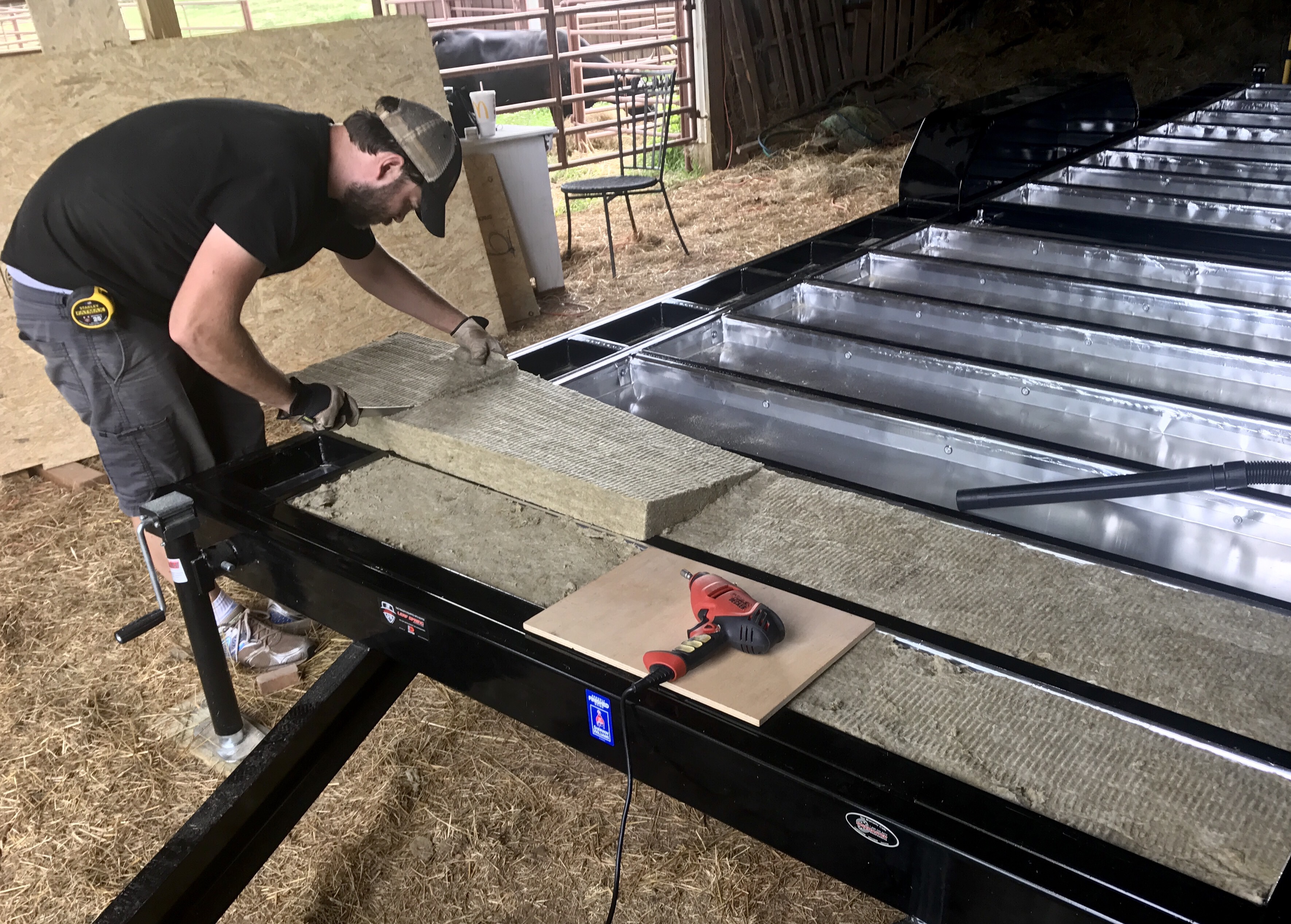 We thought it was looking good, but so did hundreds of thousands of tiny gnats and other tiny bugs common to Missouri. They must have overheard that this was a tiny house and made themselves at home! See what I did there? Tiny bugs, tiny house? See? Ok, moving on. Pretty soon we realized that they weren’t just just landing on top of the insulation (and all over us!), they were getting under the insulation that had already been installed. It was now dusk and we were swarmed! We debated spraying all the Roxul with insecticide (YUCK!), but because we didn’t know how it would react, we decided to just let it be for the night and crossed our fingers they would be gone by morning.